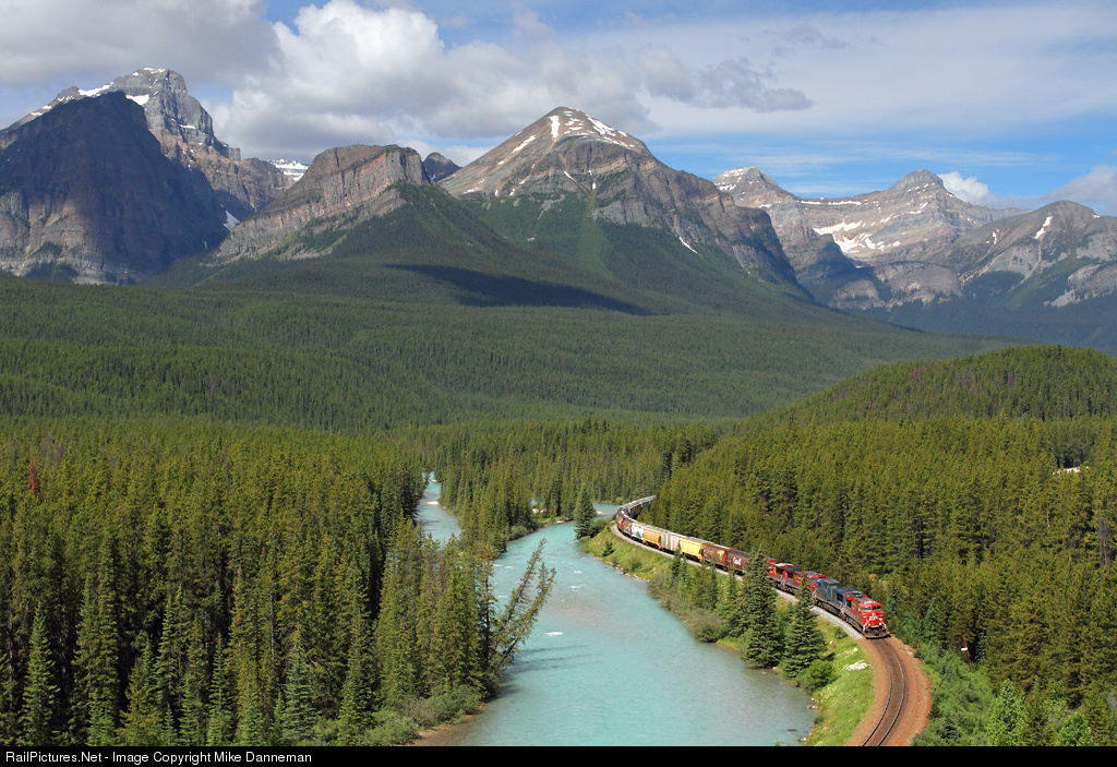 Beneath the spectacular mountains of Banff National Park, an eastbound Canadian Pacific grain train curves along the Bow River at Morant’s Curve east of Lake Louise, Alberta, on July 13, 2013.