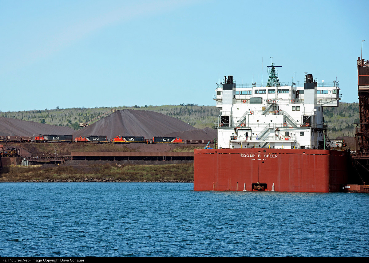 | A switch crew uses a four-unit road set to position empty ore cars into the outgoing yard at Two Harbors while the CN-owned 1000-footer Edgar B. Speer takes on a load of Minntac pellets. |