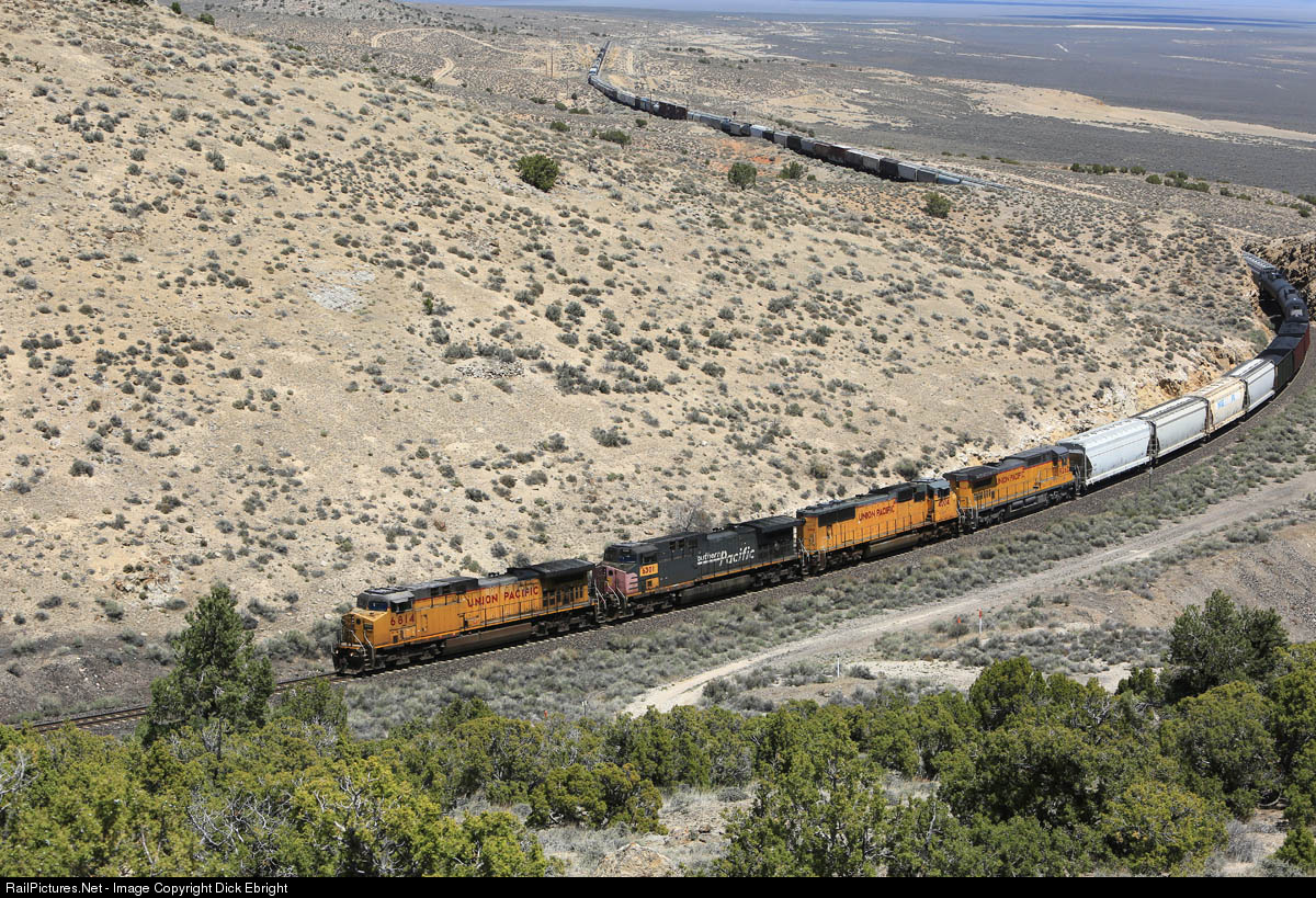 Nearly all of the MRORV, the daily Roper Yard, UT to Roseville, CA manifest has passed the west switch of Sage siding and it is now about to enter the mile long Hogan Tunnel in the Pequop Mountains of eastern Nevada. Hogan Tunnel goes under Flower Pass which is on the 1846 route of the Donner Party known as the Hastings Cutoff. The action is taking place on the ex. Western Pacific Seventh Subdivision, now the Union Pacific Shafter Sub. To get this shot I was standing on the long abandoned, temporary, switchback route over Flower Pass that was only in use until Hogan Tunnel was holed through and in service.
