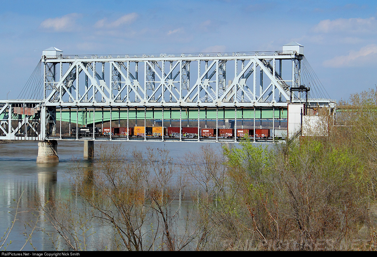 | High-hood NS GP38-2 5105 is the lone motor leading a transfer from Knoche Yard back to NS's Avondale Yard. The train is crossing the Missouri River into North KC via the Armour Swift & Burlington (AS&B) Bridge. The bridge was originally built with a second deck so on top for vehicle traffic. In order for the barge traffic to clear the lift-span raised up into the upper truss and did not interfere with road traffic which had directional lanes on each side of the upper truss.