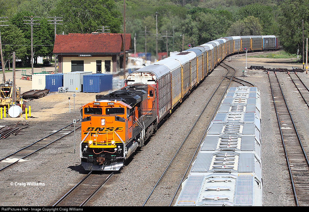 A vehicle train from Chicago, IL, to Dayton Bluffs, MN, passes over the east switch at Oregon. Oregon is located at MP 99 on the C&I. The C&I is BNSF's busy mainline west of Chicago that trains use to get on the Northern Transcon Main. New signals and containers are at Oregon in the background, which probably means the aging search light signals in this area maybe getting an upgrade soon?