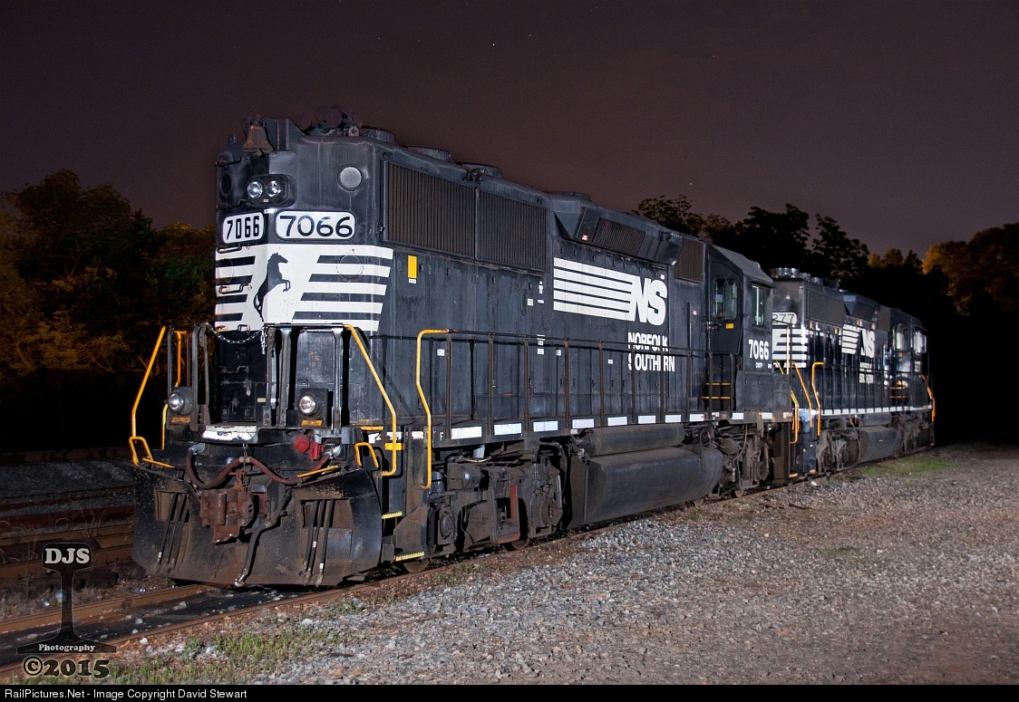 | With 15 active GP50s still remaining on the roster, the high hood GP50 will be a thing of the past along with their hood mounted bells and P5s. NS 7066 stands during the night in McDonough, Georgia with a former Southern Railway classmate, rebuilt SD40-2 3277. |