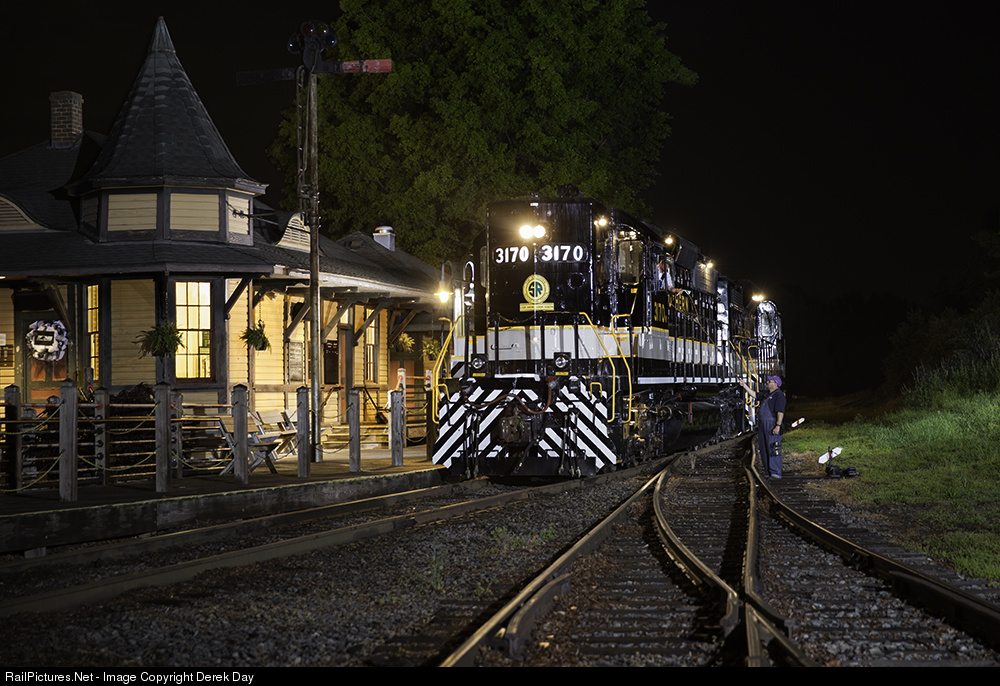 | Norfolk Southern 3170 wearing Southern paint, poses by Barber Junction Station at North Carolina's Transportation Museum. The station worker hands off a bulletin to the Conductor to alert him of conditions ahead. |