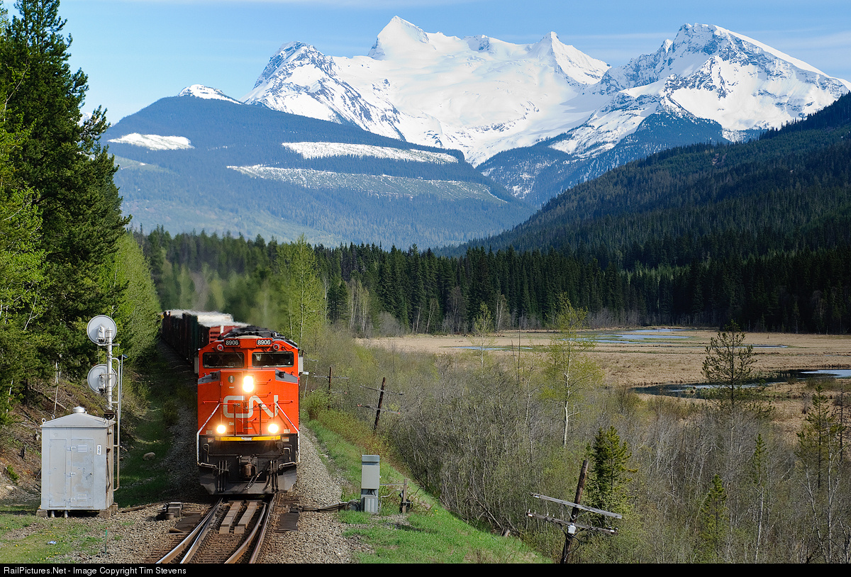 | CN SD70M-2 8906 climbs across the west switch at Albreda, on CN's Albreda Sub. The Albreda Glacier stands tall in the background and is where this subdivision of CN's gets its name from. |
