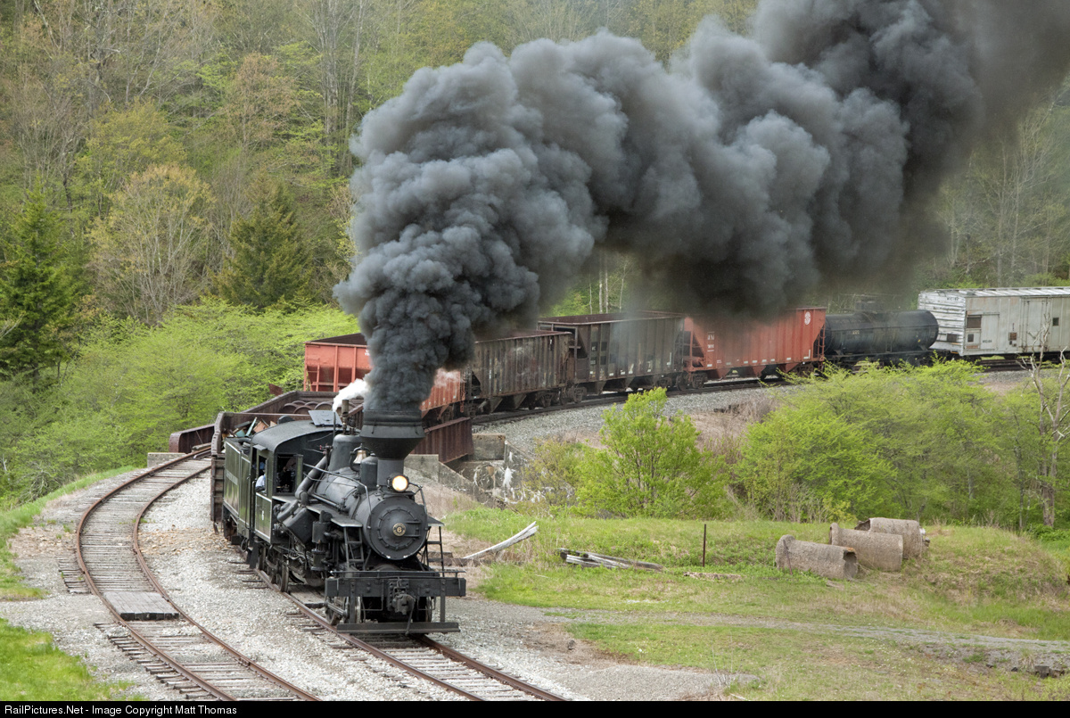 Mountain State Railroad & Logging Historical Association partnered with the Durbin & Greenbrier Valley Railroad and held it's 2015 Railfan Weekend May 15 through 17 at Cass Scenic RR State Park in Cass WV and over the Durbin & Greenbrier Valley Railroad from Cheat Bridge to Spruce. Under threatening Cass Scenic Railroad Heilser # 6 built in 1929 formerly Meadow River Lumber Company of Rainelle, West Virginia rolls over the old Western Maryland main at Spruce and toward Elkins with a freight train in tow.