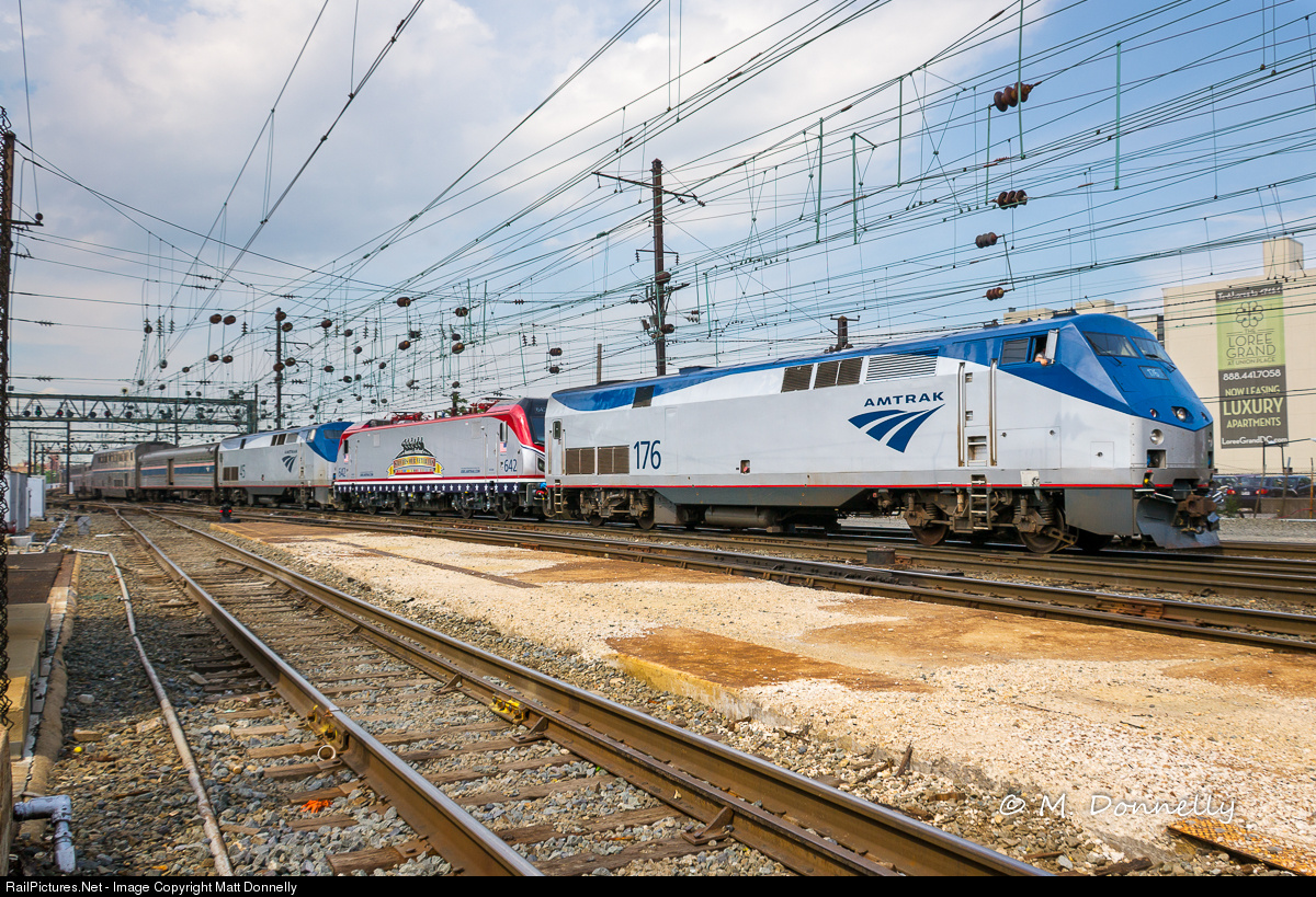 Sandwiched between two P42s on the head end of the Capitol Limited, the first Amtrak electric to wear a commemorative scheme enters "home rails" after being built in Sacramento and having final paint work completed at Amtrak's Beech Grove facility. It joins P42 #42 as a salute to our veterans and Amtrak's commitment to have 25% of new hires be veterans.