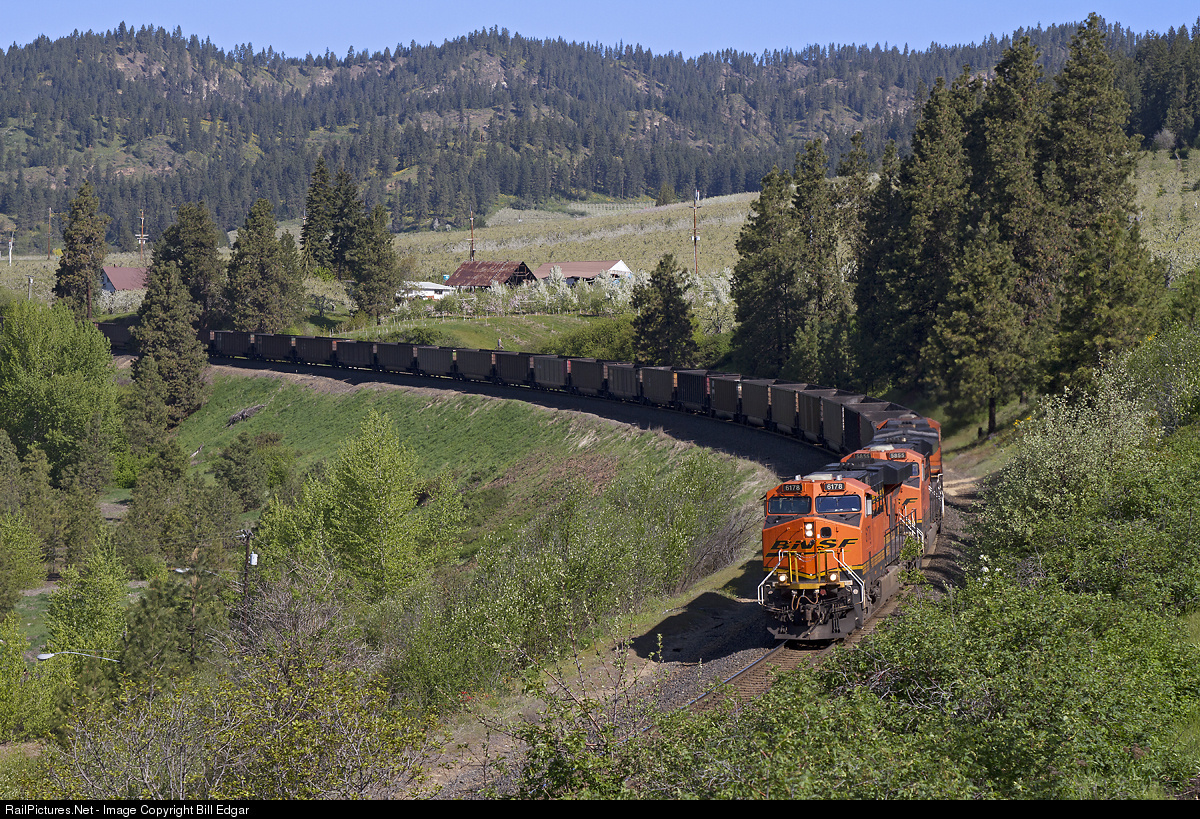 | BNSF 6178 rolls an empty coal train around the curve above the Wenatchee River east of Leavenworth, WA. Apple blossoms are in bloom as the train covers its last 20 miles into Appleyard at Wenatchee, WA for a crew change. |