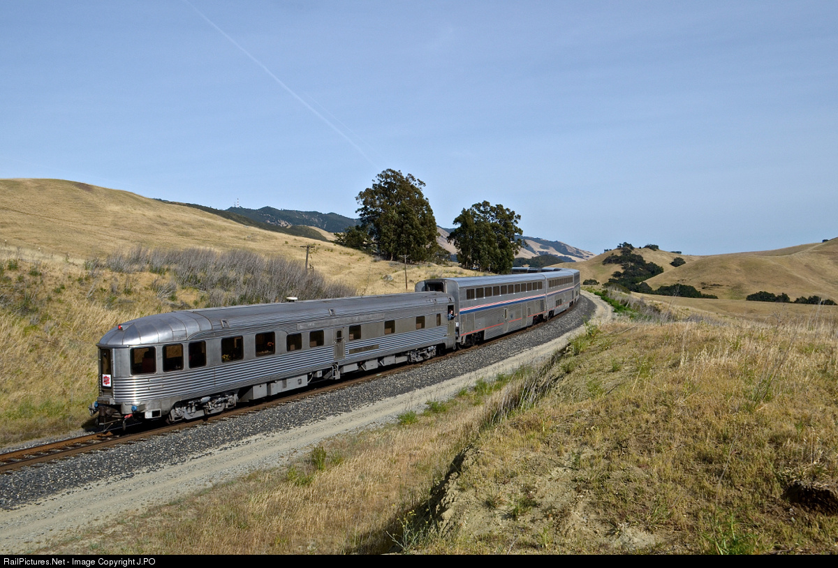 | The Northbound Starlight with the private car "Dagny Taggart" on the rear. Once a former NYC observation car, it now sports MKT logo at the end. |