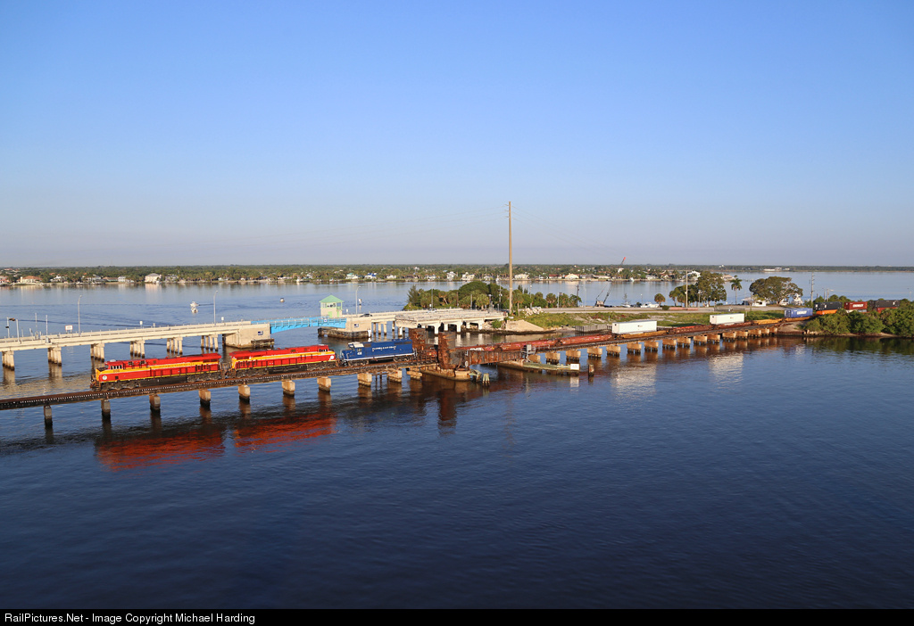 With a typical for 123 back to back pair of GEVO's and a Geep in fresh paint along for the ride FEC 123 heads south over the Stuart Drawbridge soon after sunrise on a beautiful morning.