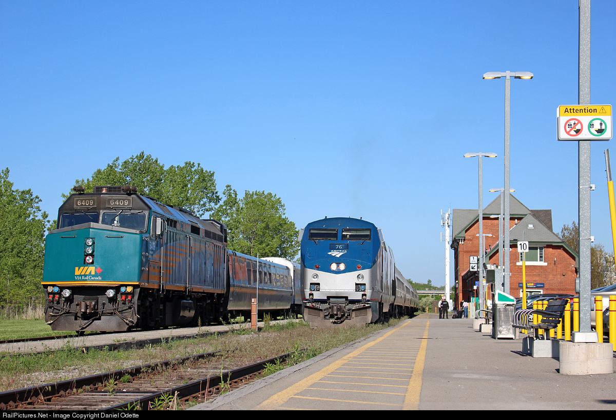 For most of the year, Via 98/Amtrak 63 waits at Niagara Falls without any company while customs is going on. Sometimes during the summer, the weekend evening GO excursion train will occupy the same track, just meters away from it. However, today is a little different. A Via Rail consist is parked on the adjacent track, bringing back memories from the not so distant past, when Via 90, 92 and 95 ran. At night, the consists would sit in very much the same spot Via 6409 is occupying. These trains were mothballed in late 2012 due to budget cuts, meaning Via Rail consists would no longer come to Niagara. Niagara Falls is still a tourist spot though, and a few specials have ran since then. This is no exception. While 98 was actually on time tonight, 694, the train number the true Via would take on left almost three hours late. I'm guessing the casino goers partied a little too hard, delaying it's departure. Via 6409 has an LRC club car along with the Glen Fraser.