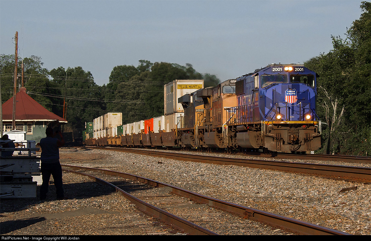 NS 213, with the Olympic Torch Relay unit (UP 2001), passes by the Southern Railway depot and a fellow railfan in Seneca, SC as the sun begins to fall towards the horizon. Judging by the consist of this train, blue and gold are the colors of the day!