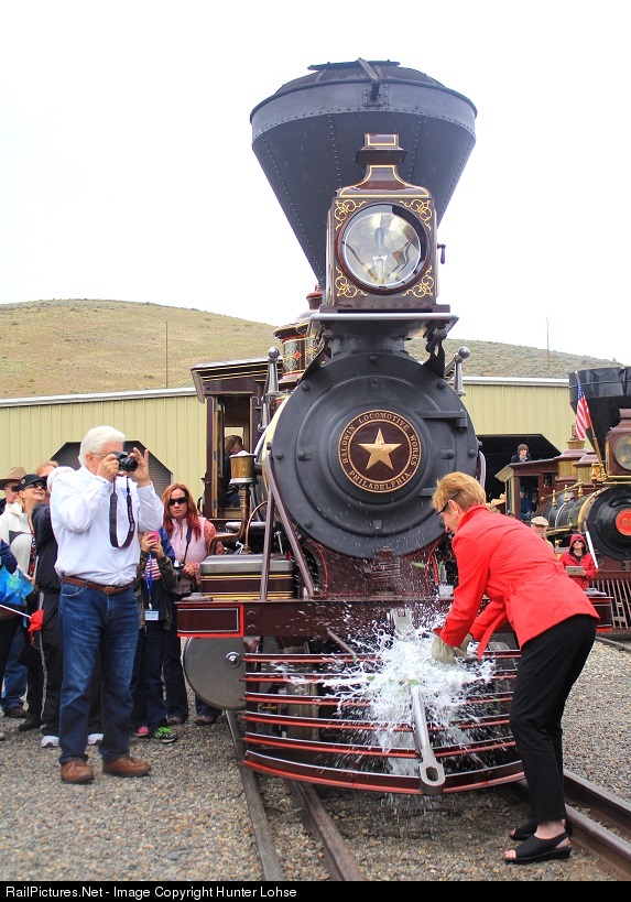 After a restoration lasting 34 years, and 140 years and 1 day to the day she arrived in Carson City, former Nevada first lady Bonnie Bryan christens the Glenbrook at the Nevada State Railroad Museum