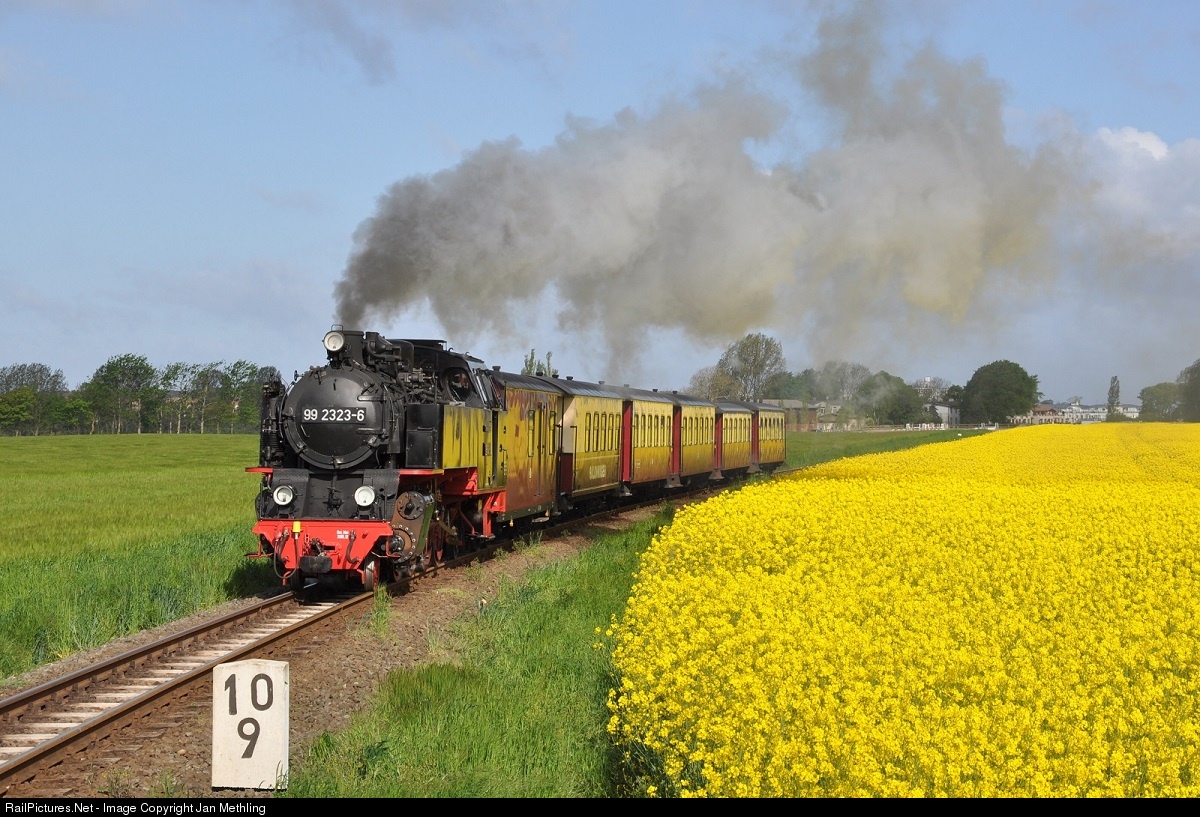 99 2323-6 passes a nice yellow rapefield on the way to Bad Doberan