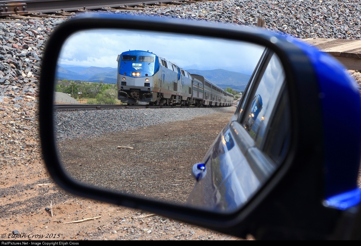 Featured here is Amtrak's eastbound Southwest Chief #4 as seen from my side view mirror, along with a reflection off of the car itself. Running slightly behind schedule, it quickly makes its way through Rowe, NM on a gorgeous mid spring afternoon.