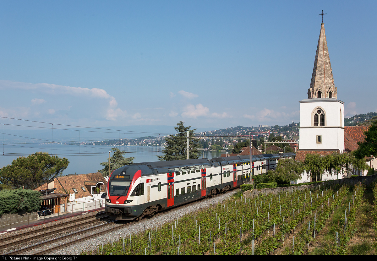 | Doubledeck trainset RABe 511 113 as RegioExpress from Geneva to Vevey is passing the church of Vilette from the 12th century, with Lake Geneva in the background. |