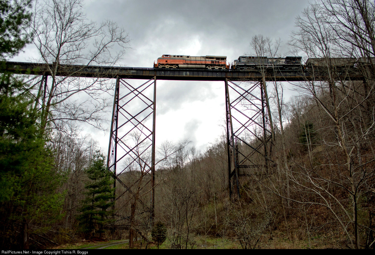 "Just like flyin..." - Local crew 82M crawls westbound across Big Lawson Trestle with an empty unit coal train bound for Alpha Natural Resources Tom's Creek facility just north of Coeburn, VA. At 150' high, a 4 degree bend, 1.6% upgrade climb at center-bridge and aging, Big Lawson Trestle is the last of four ex-N&W high trestles moving west from St. Paul to Coeburn, VA. This crew eases the 105 cars across the high trestle at less than 10mph, speeds not uncommon to the crews on Norfolk Southern's Lower Clinch Valley District.
