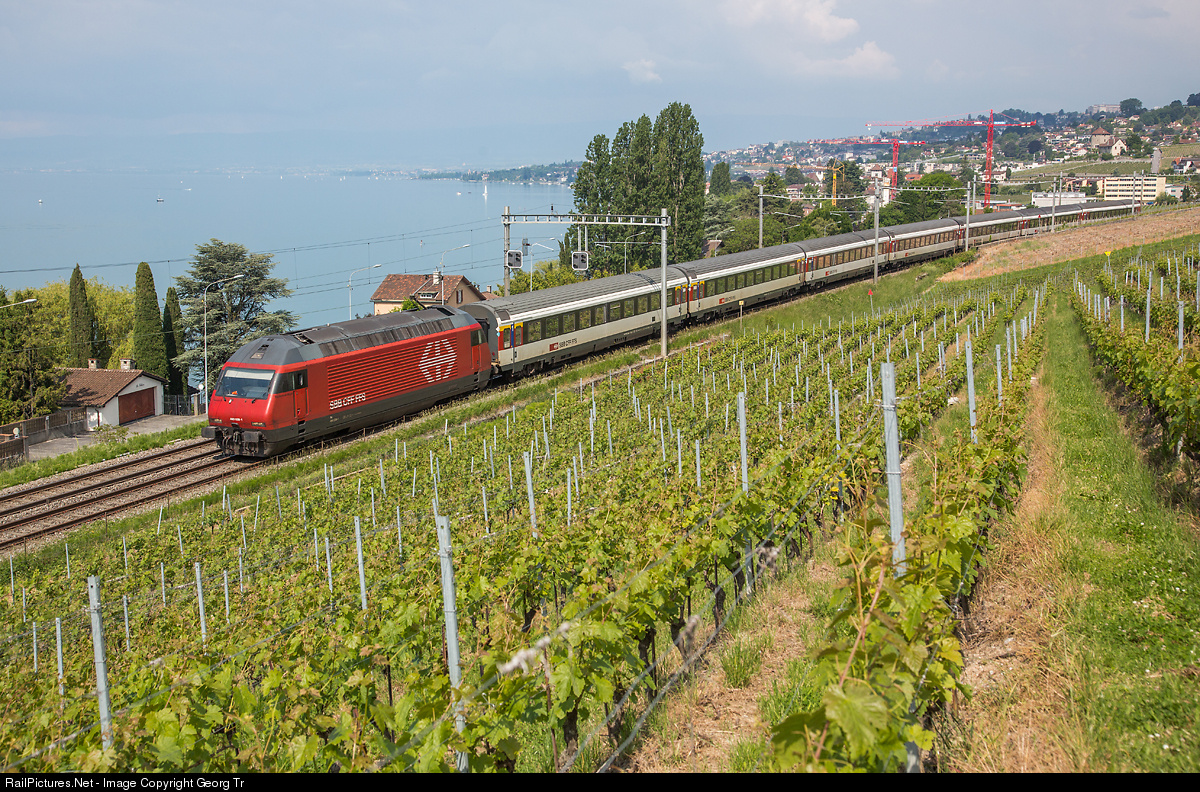 | Re 460 039 is pulling InterRegio 1813 from Geneva Airport to Brig through the vineyards near Villette along the shore of Lake Geneva. |