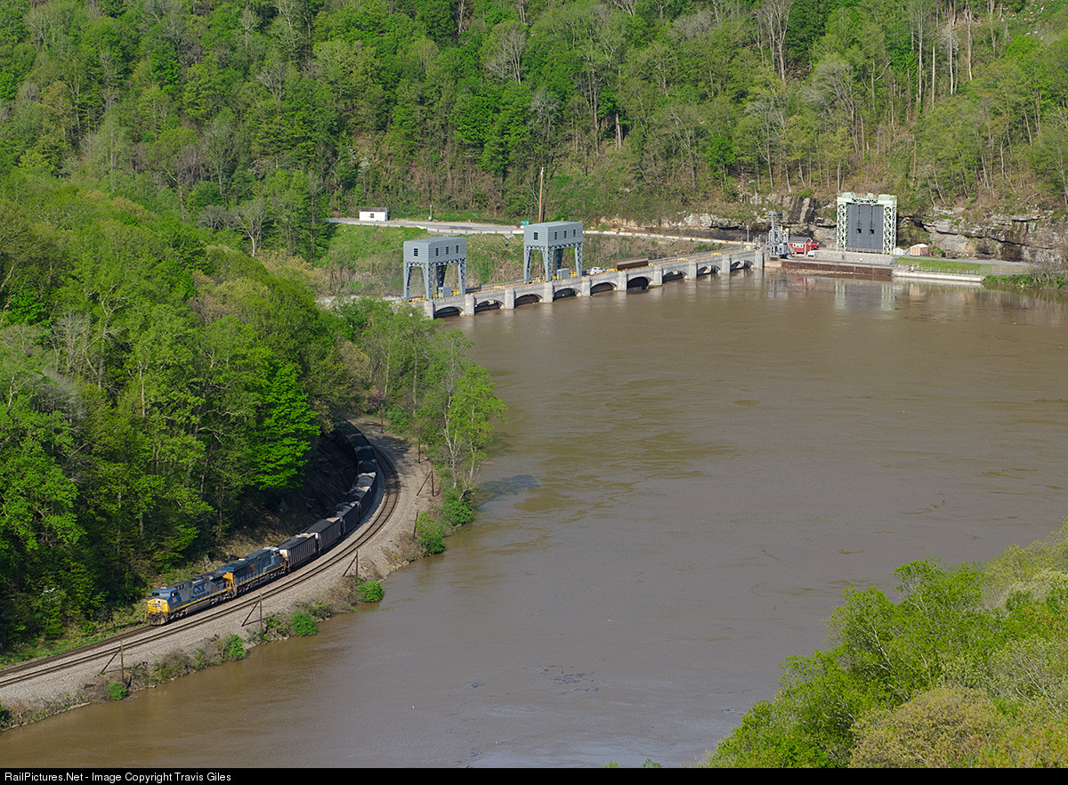 A loaded coal train rounds the curve below one of the overlooks at Hawks Nest.