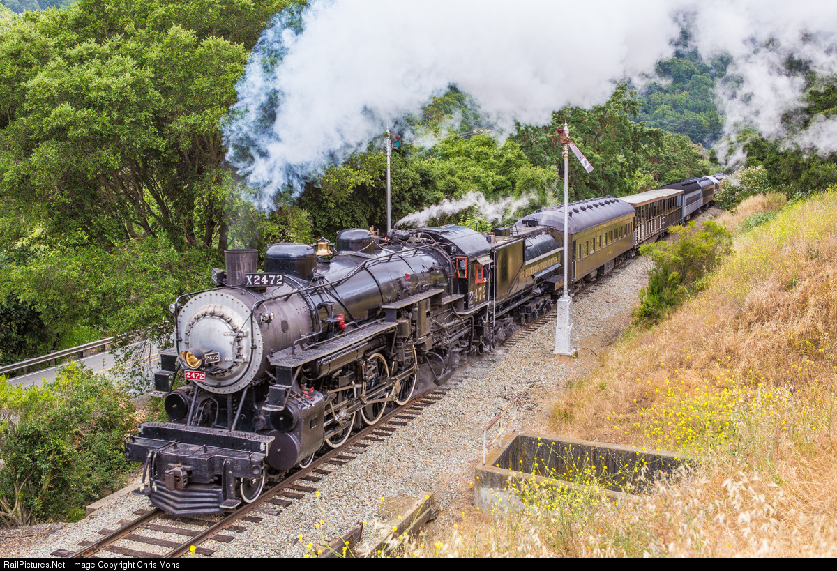 | Over the Memorial Day weekend, the Golden Gate Railroad Museum ran Southern Pacific P8 2472 through the Niles Canyon in the San Francisco Bay Area. After making up the train at Brightside Yard, the2472 highballs up the canyon to Sunol Station to load Passengers for the first run of the day. |