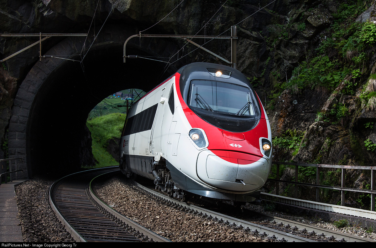 | Highspeed tilting train ETR 610 of the SBB as Eurocity 13 from Zürich to Milan passing the 40 meter long Strahlloch tunnel near Wassen. |