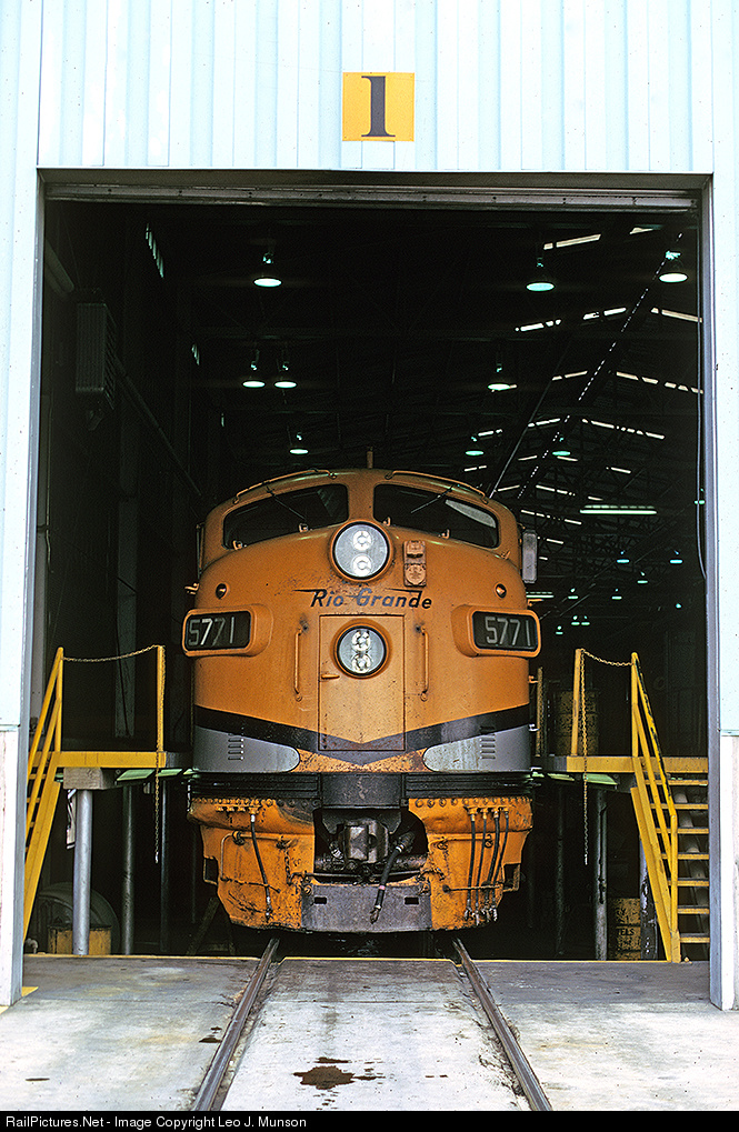 Rio Grande F9A 5771 gets serviced in the road's Burnham Shops in Denver, Colorado, on August 29th, 1973. Rio Grande was one of the few railroads (along with Rock Island and Southern Railway) that did not join Amtrak when that carrier was formed in 1971. As such, the Rio Grande - and 5771 - continued in passenger service on the Rio Grande Zephyr , the Denver to Salt Lake City, Utah, segment of the once legendary California Zephyr .