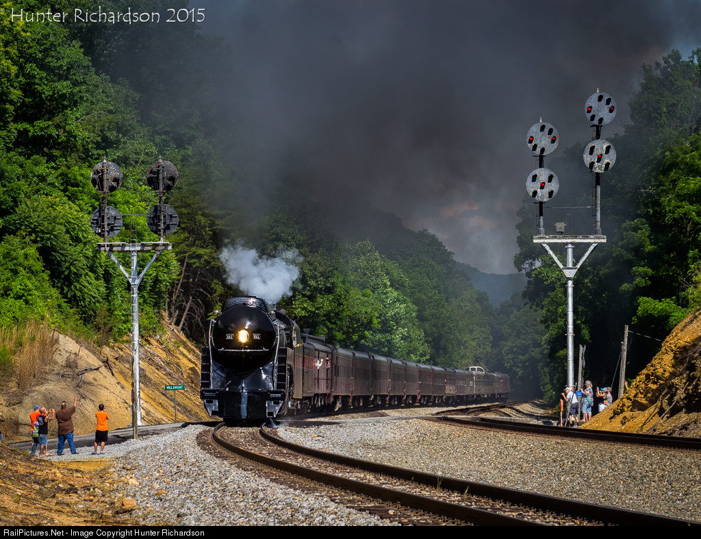 | Staged in a classic N&W scene, Norfolk and Western J Class Steam Locomotive 611 puts on a fantastic show and splits the iconic N&W CPL's as it works up the 1.34% grade through Villamont, Virginia. It was a treat to watch, as CEO Wick Moorman was behind the throttle as it walked up the former N&W main. |
