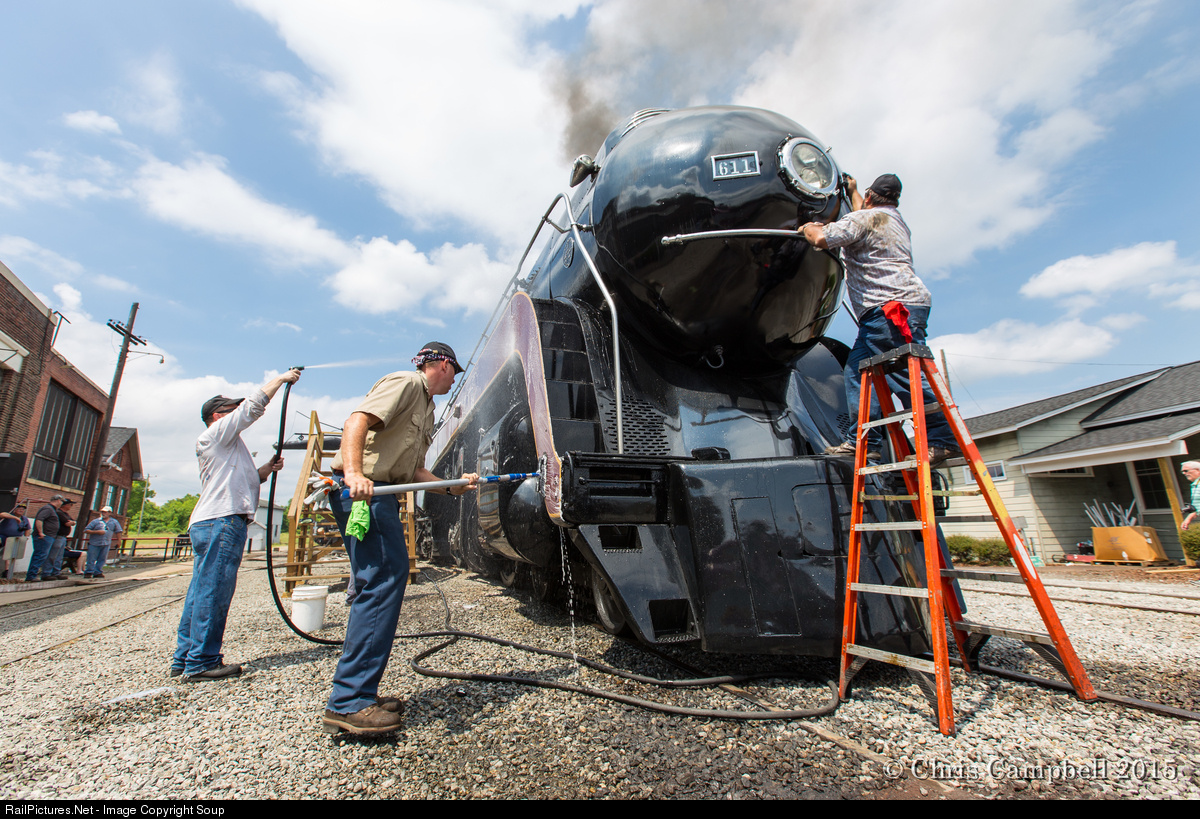Newly renovated 611 gets a bath on her 65th birthday in preparation for her historic homecoming run to Roanoke the following day