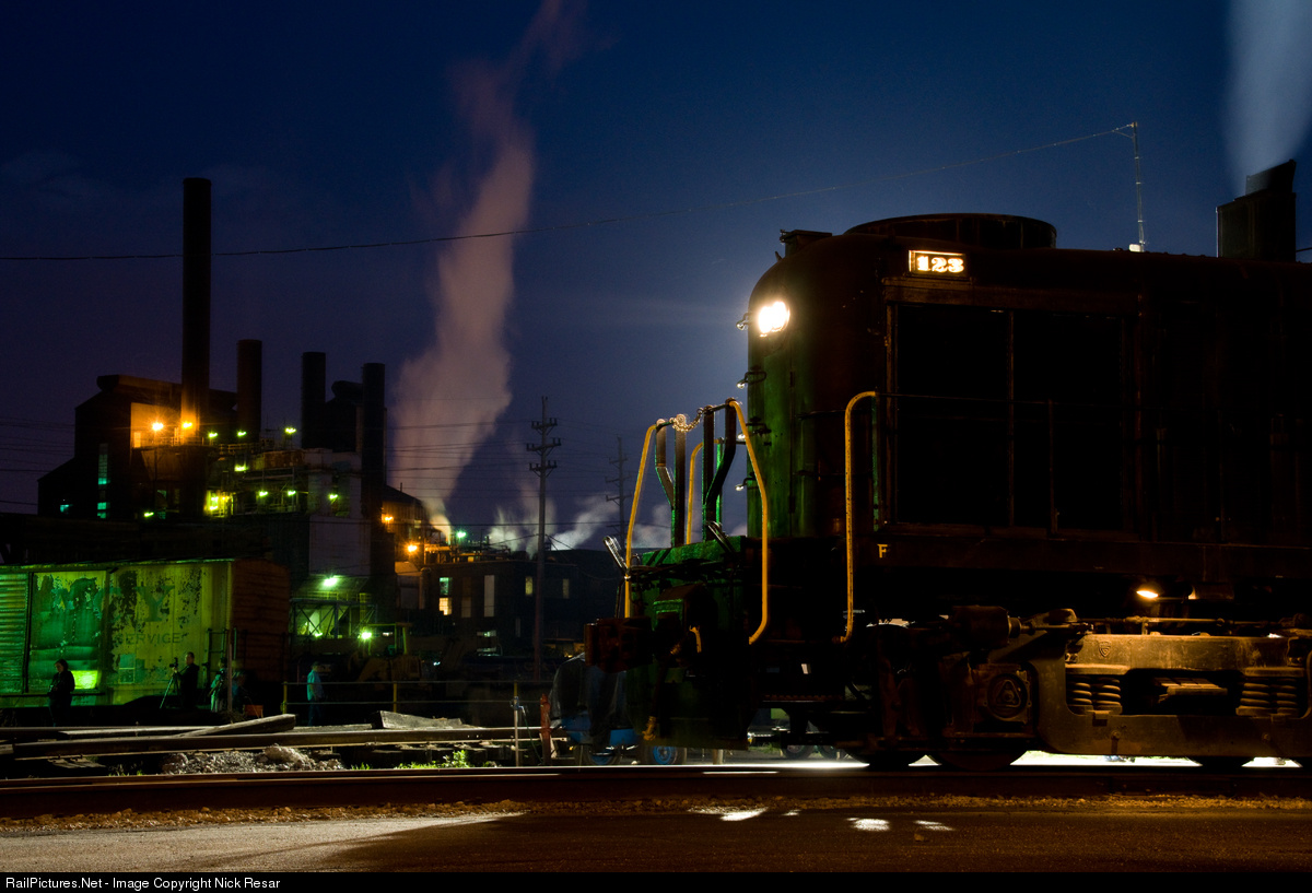 | The Midwest Railway Preservation Society had a night shoot after their open house on May 9th. No. 123 posed with a short freight while a steel mill simmers in the background. |