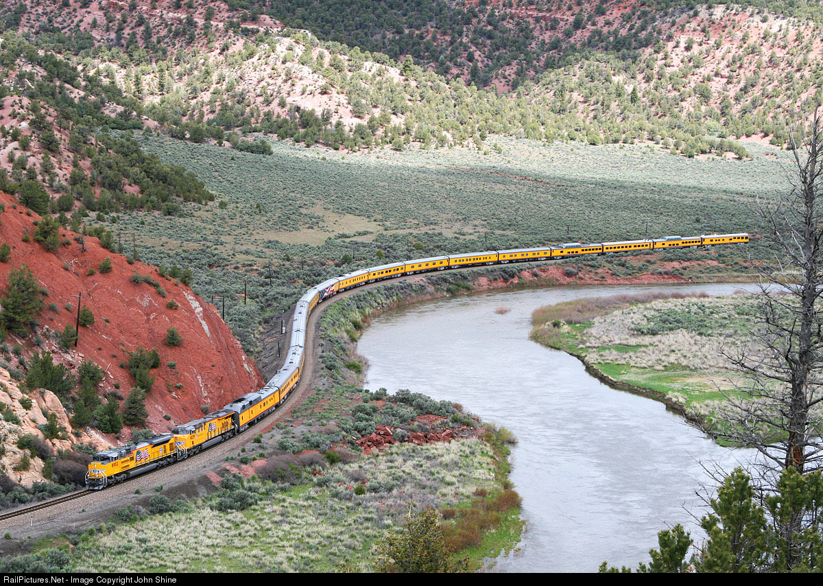 | Heading Westbound, this UP special follows the curves of the Colorado River as it approaches the siding at Yarmony. |
