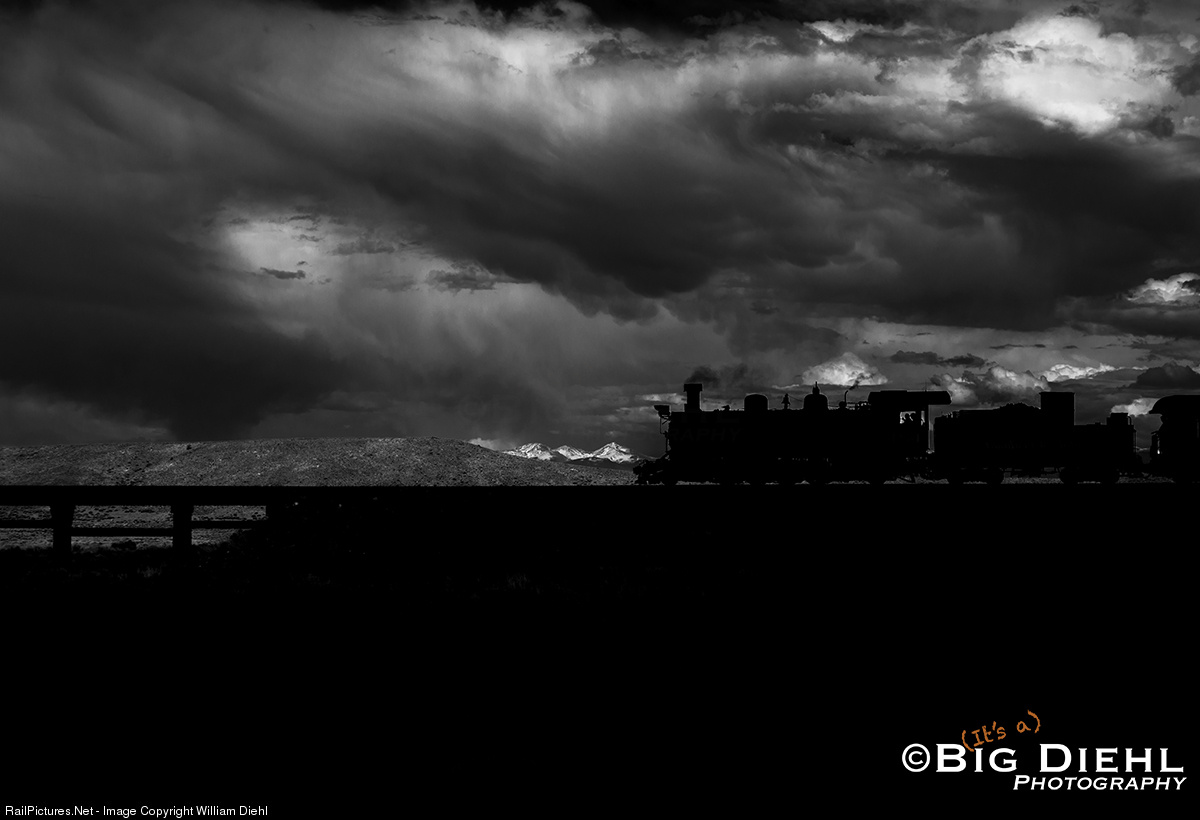 Silhouetted against the Sangre de Christo Mountain range of Southern Colorado, the daily eastbound train of the Cumbres and Toltec trundles across the southwester edge of the San Luis Valley on its way to the home terminal of Antonito.