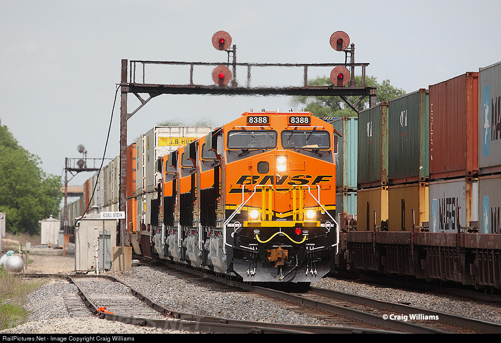 Westbound Willow Springs, IL, to North Bay, CA, Z-train hammers thru the crossovers at Edelstein as they meet an eastbound stack train. Today's Z-train has 4 new C4 GE's fresh off the factory floor. The train is 138 miles west of Chicago and just topped the Edelstein grade west of Chillicothe.