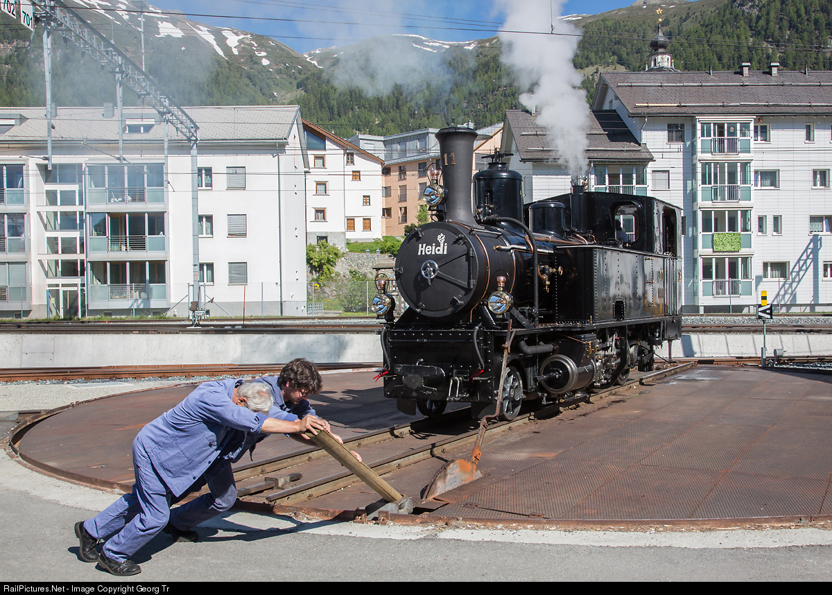 Steamlocomotive G 3/4 # 11 "Heidi", built in 1902 by SLM, beeing turned on the turntable of Samedan. The locomotive was completely refurbished over years by members of association "Club 1889", got a new boiler and was converted to burn light oil (diesel).