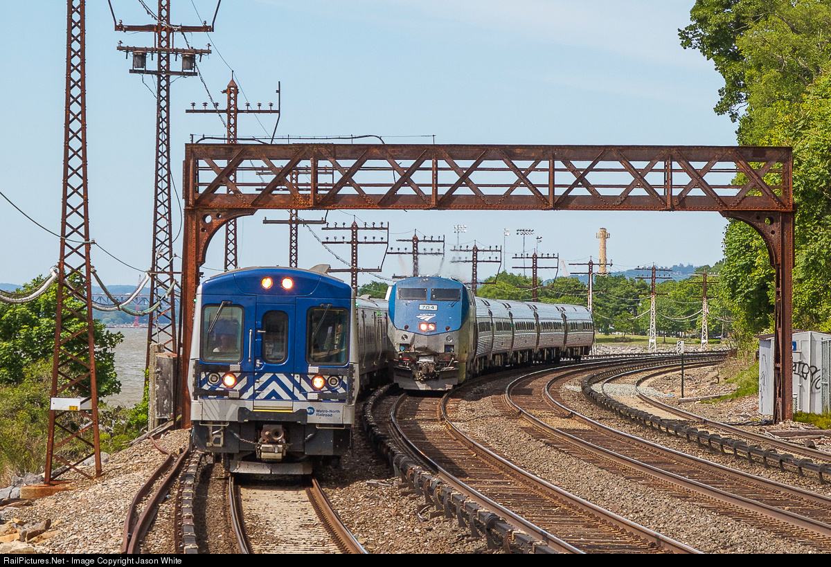 A common scene that happens on the Hudson Line below Croton Harmon, a set of M7's is being slowly overtaken by a southbound Empire Service train en route to Penn Station.