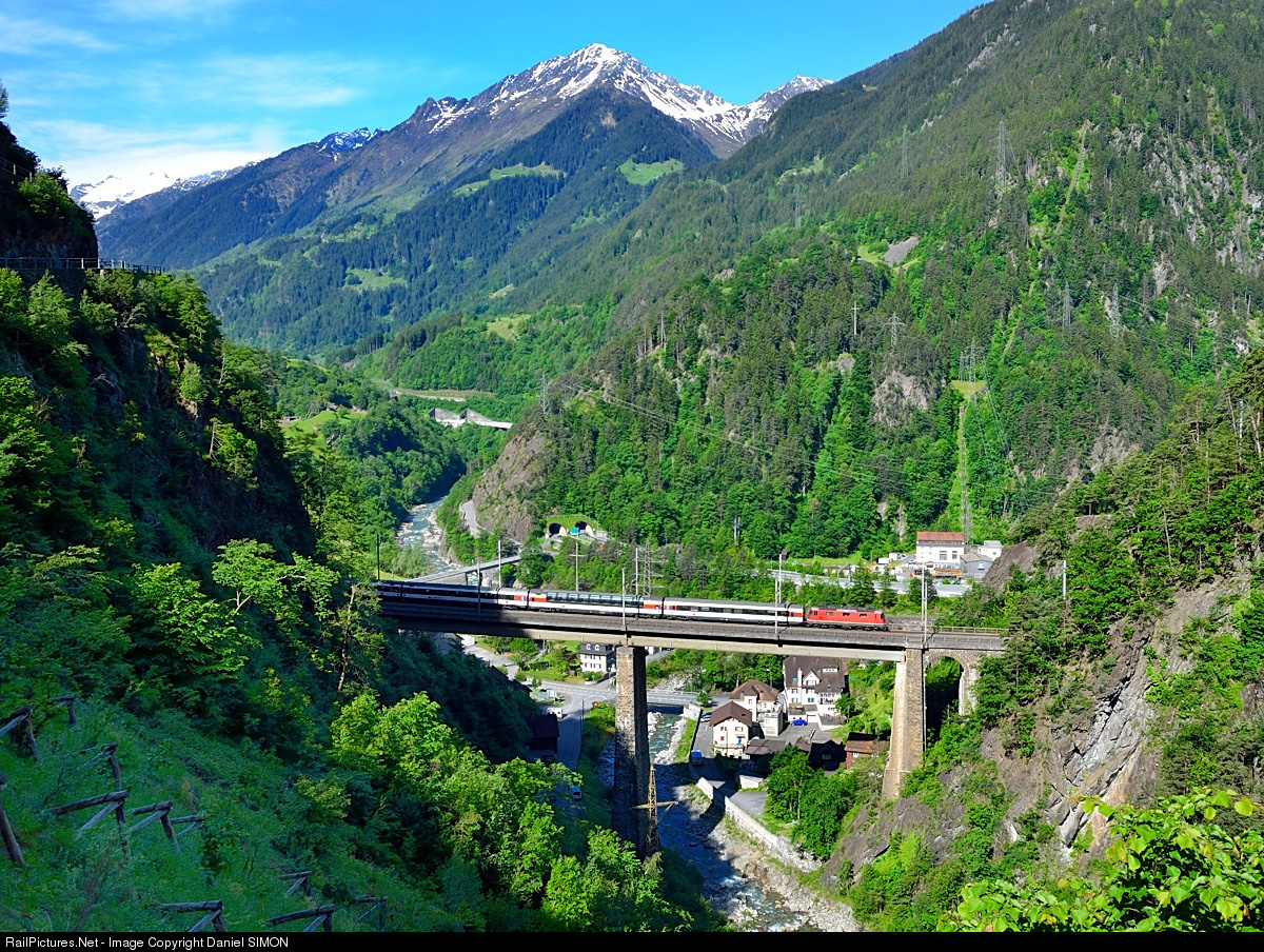 | An Intercity train hauled by an Re 4/4 II is crossing the mighty Kerstelenbach Viaduct near the village of Amsteg. The view is taken from the very narrow road climbing up to the village of Bristen. |
