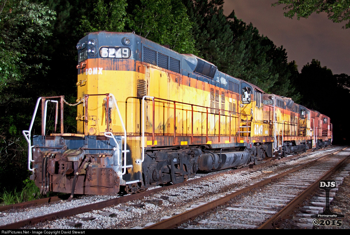 End of the line for the vintage fleet of Hampton & Branchville GP9s from Chessie System and N&W. They're seen during the early hours of June 8, 2015 in Monroe, Georgia at Powerrail Locomotive Services.