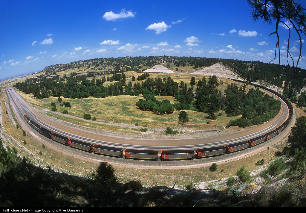 A loaded Burlington Northern Santa Fe coal train bends through the big horseshoe curve below Belmont, Nebraska, as it climbs Crawford Hill on July 22, 2003.