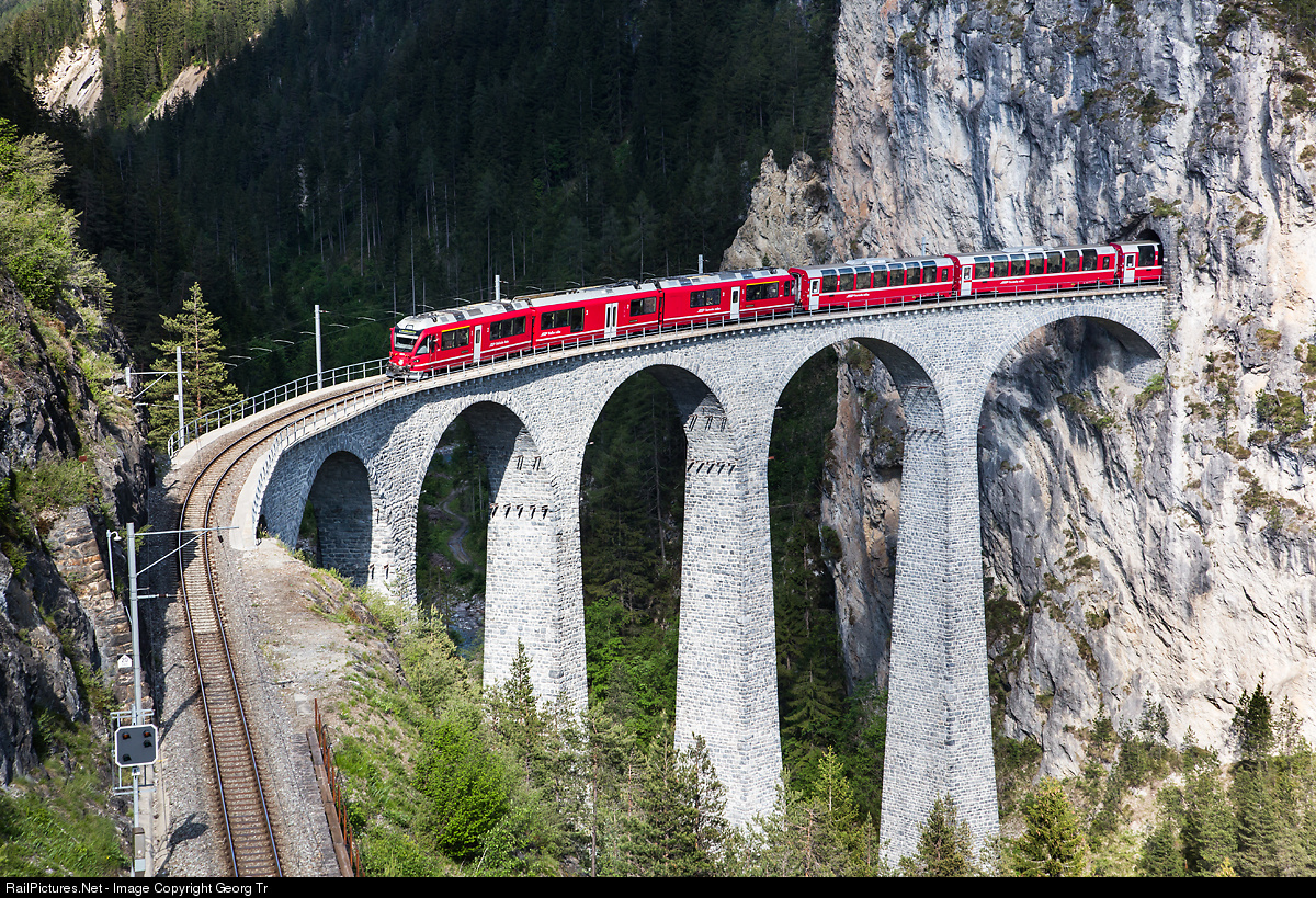"Allegra" ABe 8/12 # 3504 with the panorama cars of the BERNINA EXPRESS crossing the 65 meter high Landwasser viaduct near Filisur.