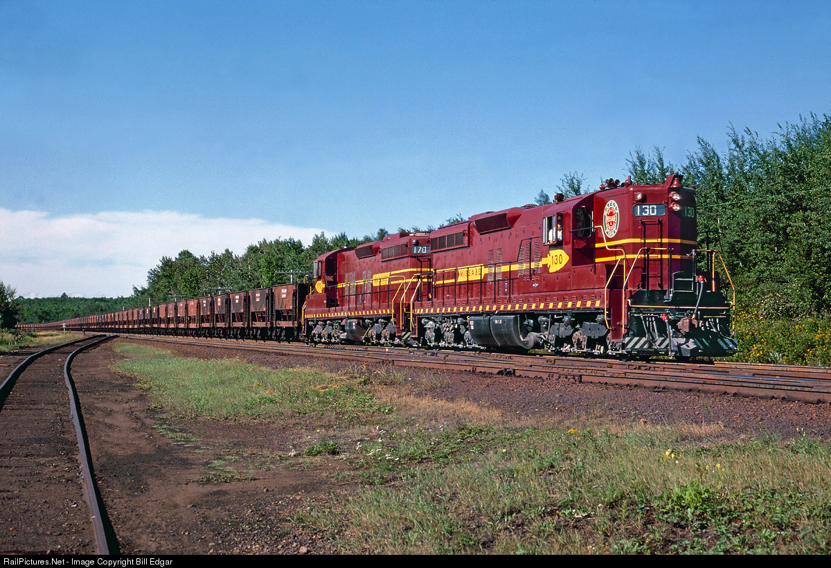 DMIR SD9 no. 130, one of two boiler equipped units on the railroad leads an empty ore drag from the Duluth docks into Proctor Yard. Showing off the freshly re-painted Arrowhead scheme, these 20 year old units have no trouble handling a string of antique Soo Line ore jennies up the hill. In the days of raw ore, it was common for the Duluth area railroads to interchange their ore cars to mix ores in the docks to steel mill specifications. Life is much more efficient today with the handling of taconite pellets.