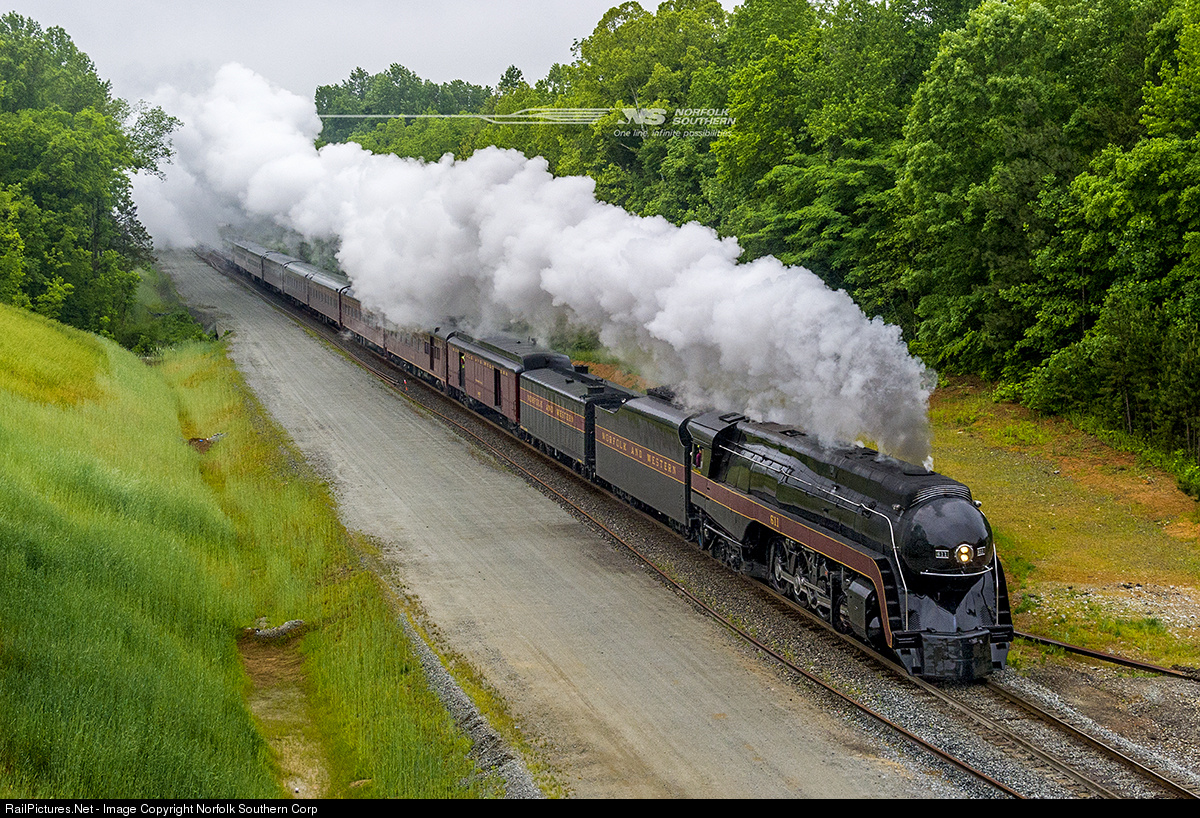 During its mainline test run on May 21, 2015, Norfolk and Western class J number 611 sprints along the Piedmont Division mainline at milepost 311 near Thomasville, North Carolina with train number 957. Photo by Casey Thomason. For more information about Norfolk Southern, visit www.nscorp.com