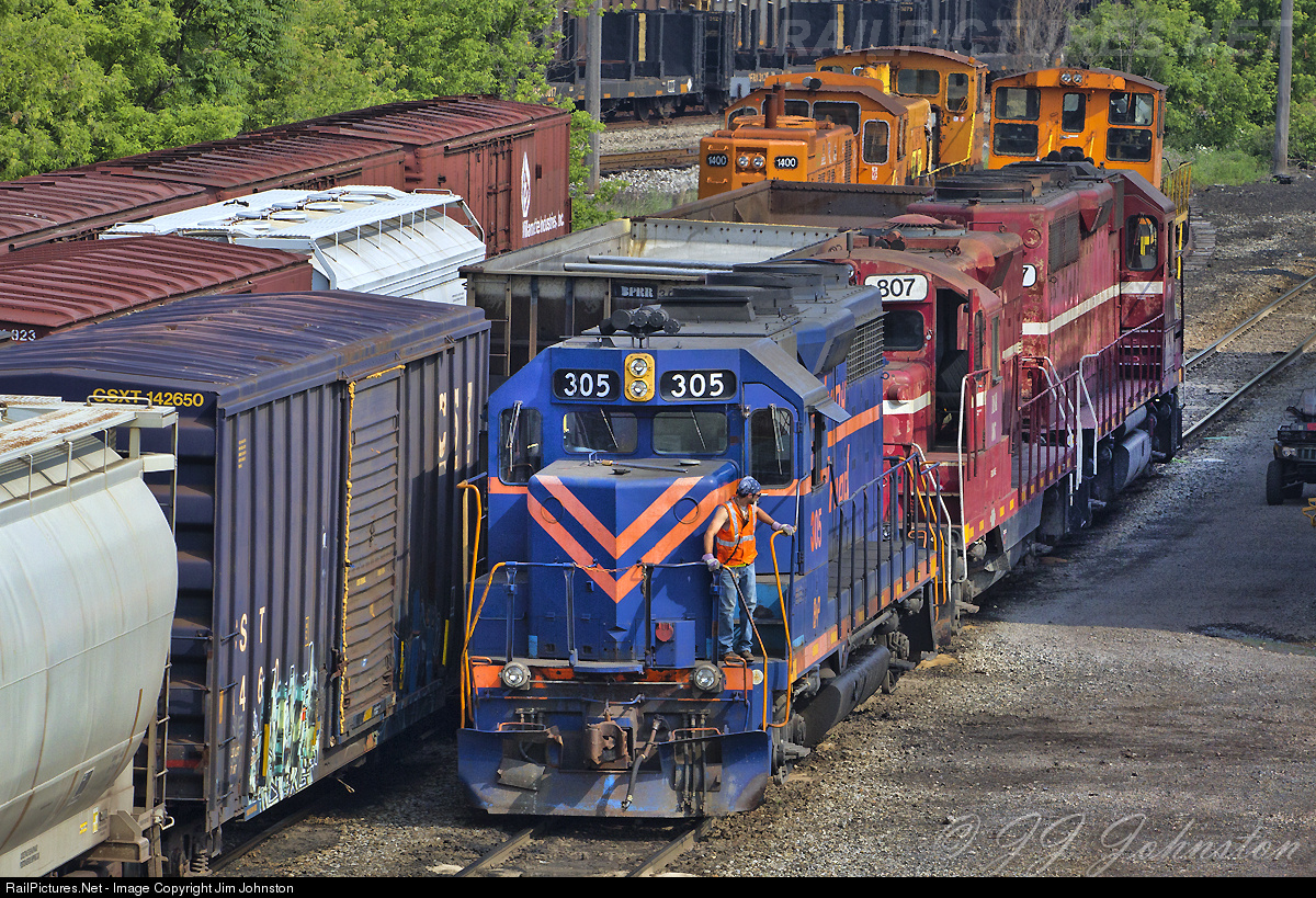 | A trio of engines gets looked over by a crew member shortly before leaving the yard. Leading was the BPRR 305 still in Allegheny Railroad scheme, with the Rochester and Southern RSR 807 Road slug and RSR 3807 GP40-3. |
