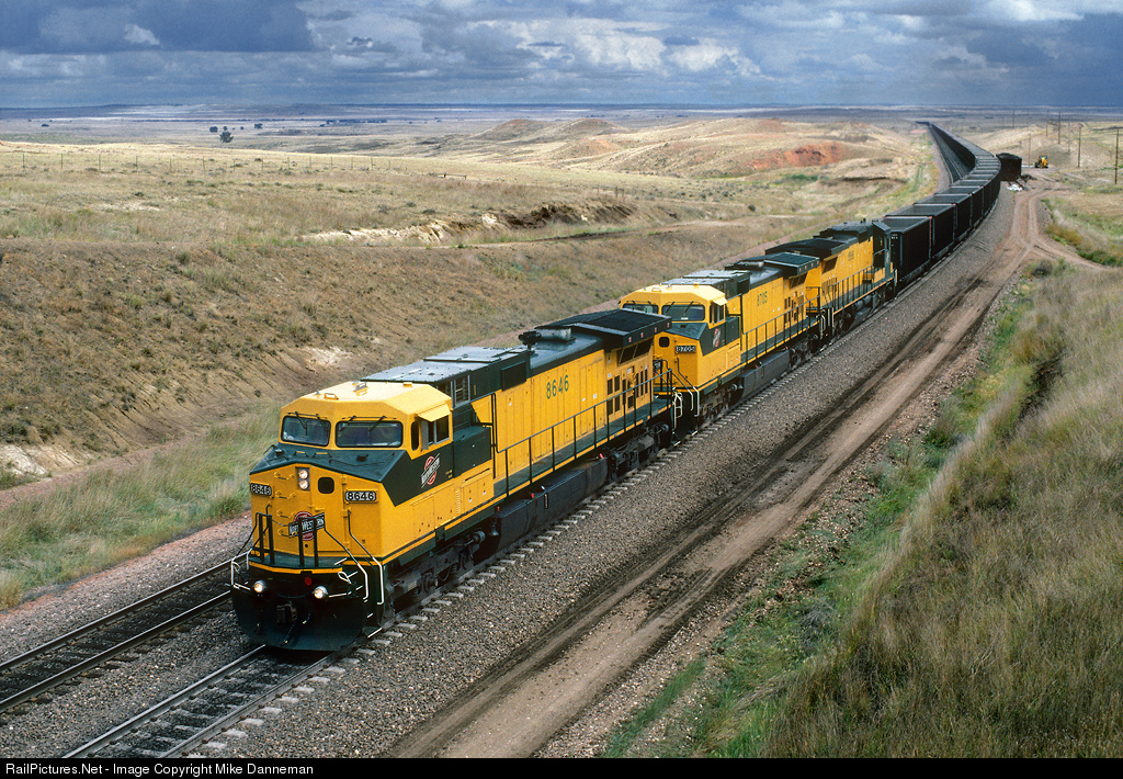 A Chicago and North Western coal train crests the top of Logan Hill north of Bill, Wyoming, on July 7, 1994. Two new C44-9Ws lead an older C40-8 as power, all in nice, clean yellow and green…