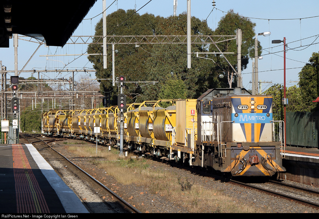 T373 works a loaded Metro ballast through platform 1 at Caulfield.