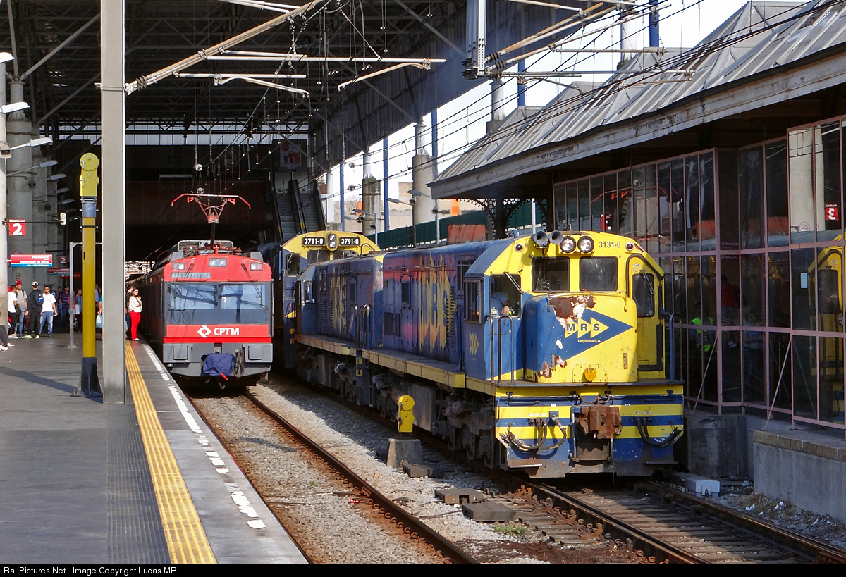 | Busy afternoon at Bras station: Commuter train CAF Series 2100 standing by at platform 2, while westbound MRS receives clear signal to proceed to Luz station, led by GE U20C #3131. |