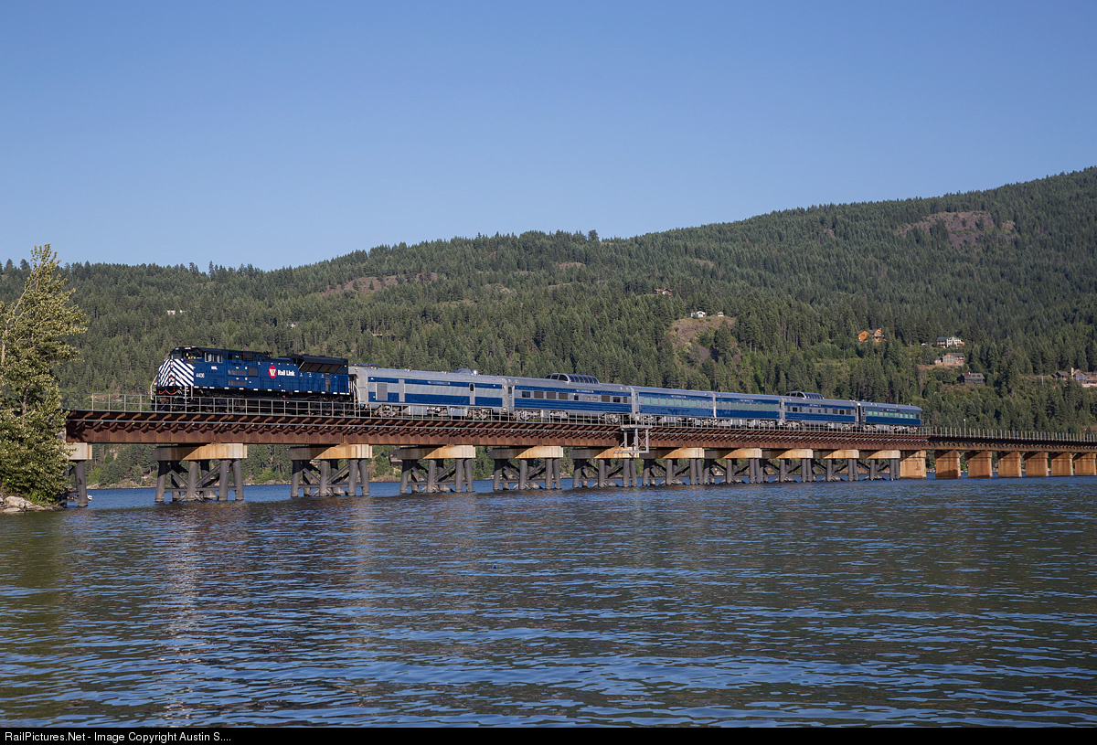 | The Montana Rail Link business car train makes a very rare appearance over Lake Pend Oreille while returning from Spokane where the train was wyed after running west out of Missoula in the morning for a family reunion of a business partner of Washington Companies founder Dennis Washington. |