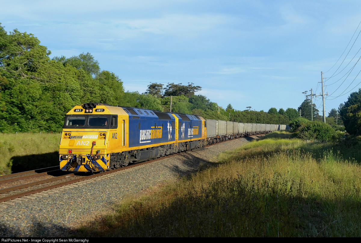| Doubled headed AN class, AN2 & AN7 haul the empty garbage containers through Exeter on their way towards Sydney. |
