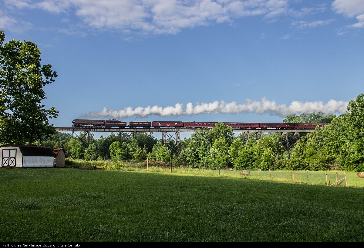 | It is bright as early as Norfolk and Western "J" 611 leads a morning excursion out of Lynchburg, VA across the Possum Creek trestle. |