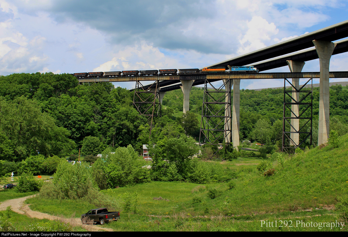 | Standing at a towering 195ft tall, Mingo Creek Viaduct is the tallest bridge on the Wheeling & Lake Erie system, on this day WE 6348 still in EMD leaser colors and WE 6989 still in H1 BNSF colors lead 57 coke empties across the bridge on their way to Monessen, Pa |