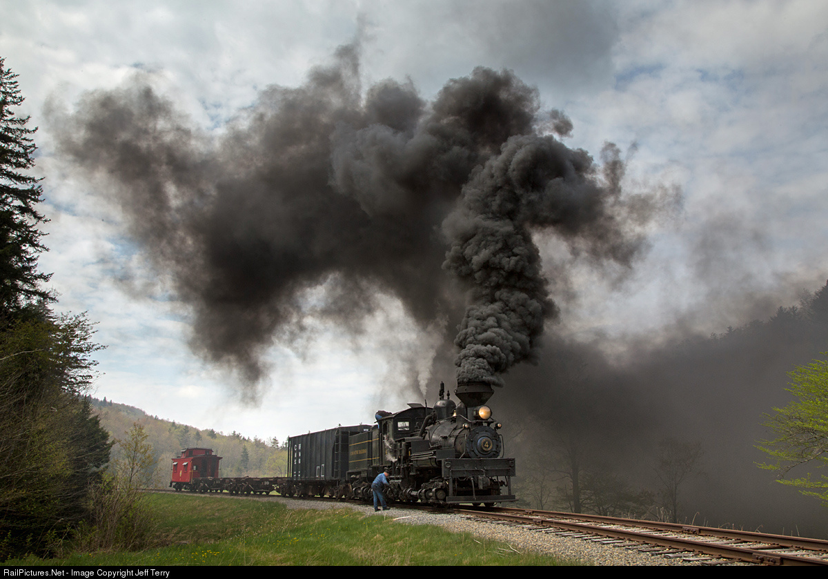 Coal smoke fills the air as Shay 4 pauses with a short freight train at Spruce.