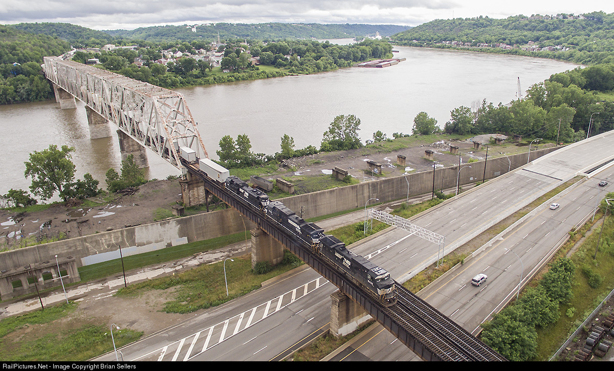 NS 216 eases its way across the Ohio River Bridge into Gest Street yard in Cincinnati. Taken with a DJI Phantom 3 Quadcopter / Drone.