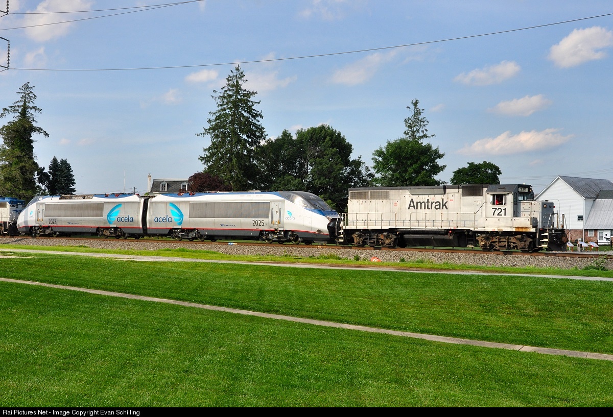 | Its very rare you will ever see two Acela locomotives being pulled by a diesel. Its even more rare when it occurs on Norfolk Southern Territory. But that is the case on this day. KP701 takes two Acela locomotives to the Bear, Delaware car shops. It is unknown whether the locomotives will be serviced at the shops or be reunited with a fresh passenger trainset for the Northeast Corridor. A few years ago Matt Donnelly said "Some real oddball stuff can be seen on these moves." This is definitely what he was talking about. |